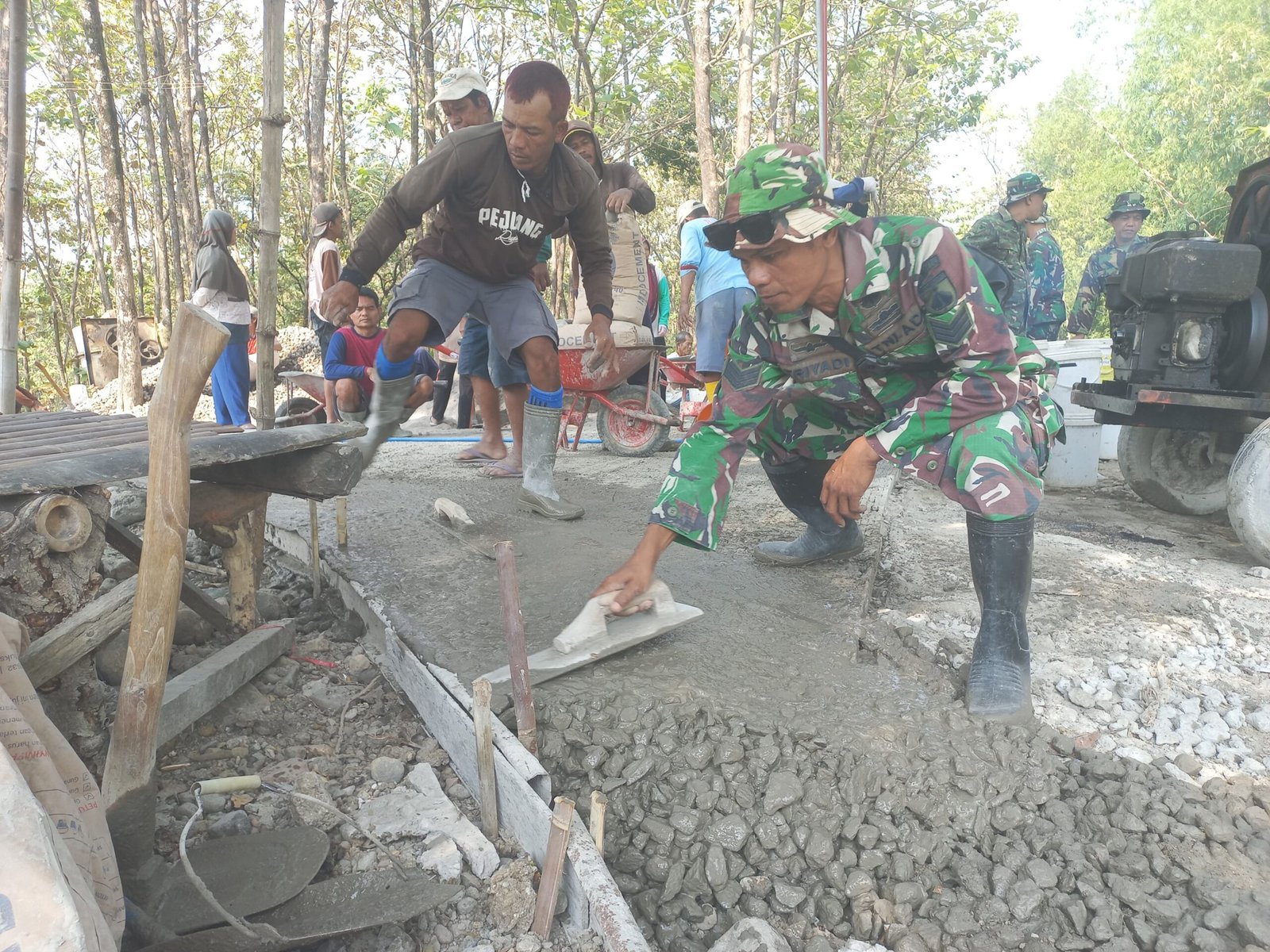 Dengan penuh semangat, para anggota Satgas bersama warga memainkan roskam—alat gosok sederhana dari kayu—untuk meratakan dan menghaluskan material cor. Aktivitas ini menjadi pemandangan yang menggambarkan kerja keras dan sinergi nyata antara TNI dan masyarakat.