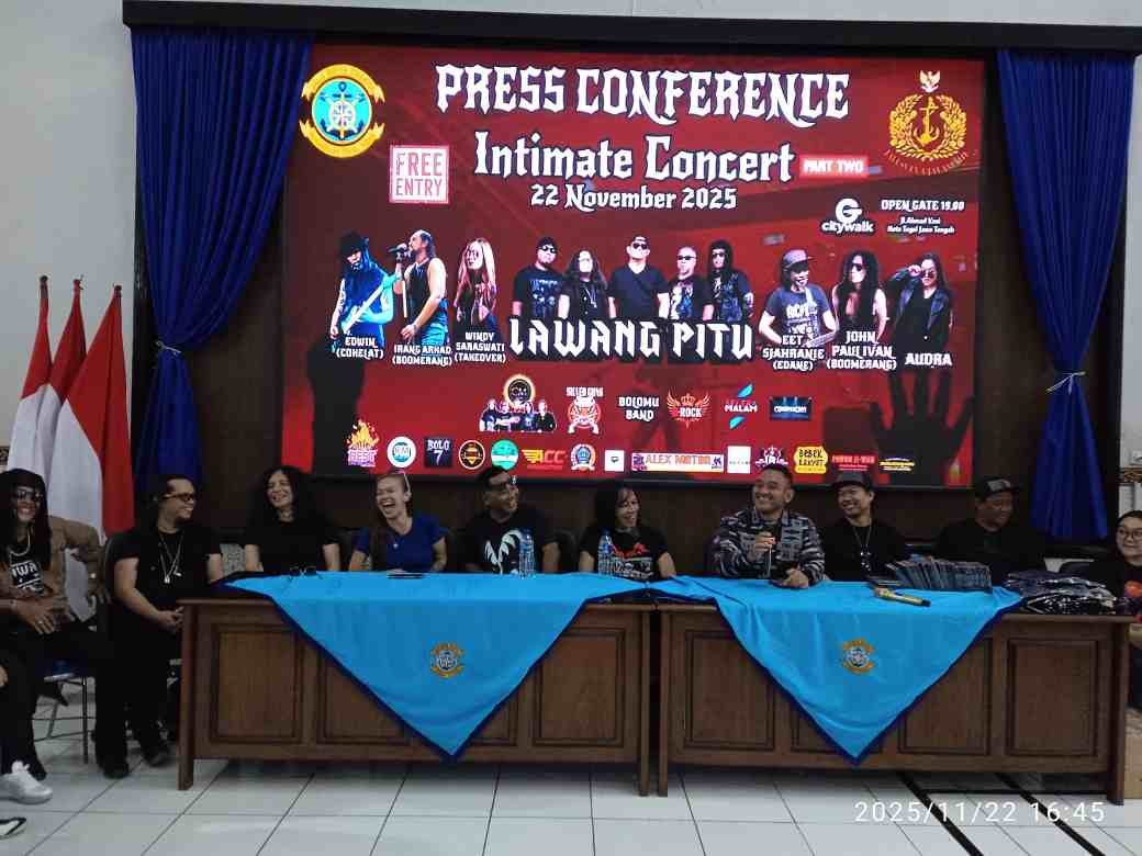 EMSATUNEWS.CO.ID, TEGAL – Band metal Lawang Pitu membuat gebrakan di kota Tegal dengan mengadakan konfrensi pers di Lantamal V Tegal, Sabtu (22/11/2025). Acara ini menjadi lebih meriah dengan kehadiran band-band nasional seperti Coklar, Edane, dan Gumerang.