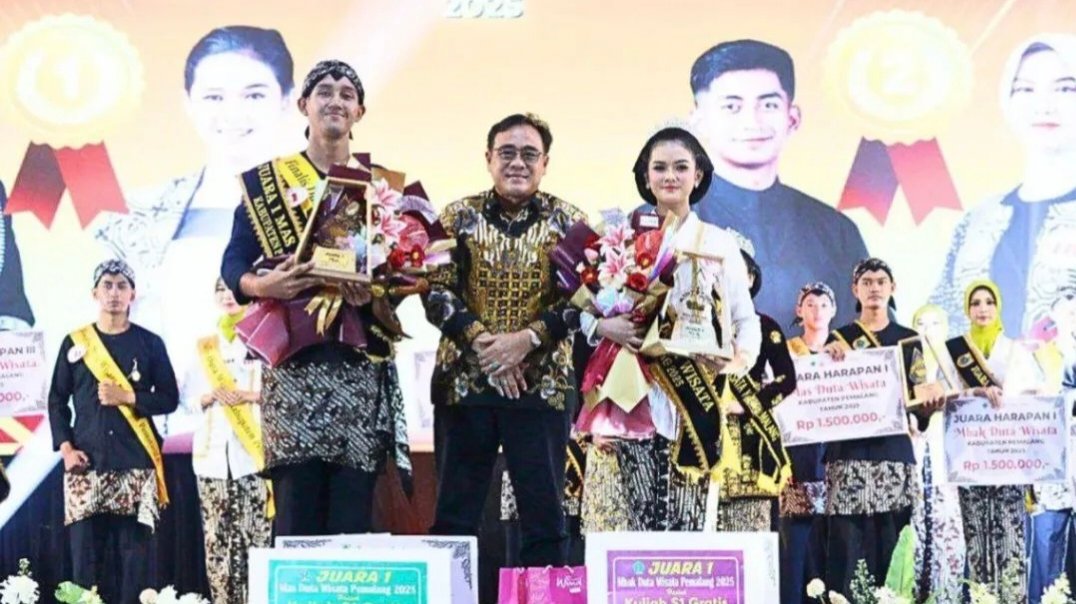 Emsatunews.co.id, Pemalang – Aghni Istihadul Ahbab dari SMKN 1 Randudongkal dan Galo Prasasti dari SMAN 1 Randudongkal resmi dinobatkan sebagai Juara I Duta Wisata Pemalang 2025. Keduanya meraih gelar bergengsi tersebut dalam Malam Grand Final Pemilihan Mas dan Mbak Duta Wisata Kabupaten Pemalang Tahun 2025 yang digelar di RGP Convention Center pada Rabu malam, 19 November 2025.