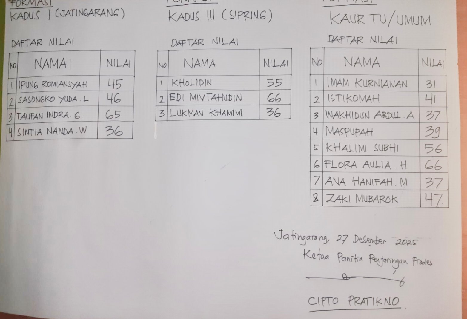 Ketua Panitia, Cipto Pratikno, merinci bahwa formasi yang diperebutkan adalah Kepala Dusun (Kadus) 1, Kadus 3, serta Kaur Umum atau TU. Menariknya, peminat tidak hanya berasal dari warga lokal Jatingarang. Beberapa peserta tercatat datang dari Desa Wonogiri (Kecamatan Ampelgading), serta Desa Bodeh dan Desa Kwasen (Kecamatan Bodeh).