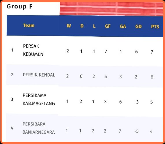 Persak Kebumen berada di posisi puncak dengan 7 poin, Persik Kendal 6 poin, Persikama Kabupaten Magelang 5 poin, dan Persibara Banjarnegara 4 poin.