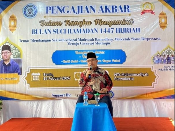 Emsatunews.co.id || Purwokerto, Banyumas ~ Sekitar 200 jamaah yang terdiri dari calon wali murid, wali murid, serta tamu undangan menghadiri Tabligh Akbar dalam rangka menyambut bulan suci Ramadhan 1447 H yang digelar oleh MTs Muhammadiyah Purwokerto. Kegiatan yang berlangsung khidmat tersebut dilaksanakan di halaman sekolah pada Ahad, 16 Februari 2026, dan dimulai sejak pukul 07.30 WIB.