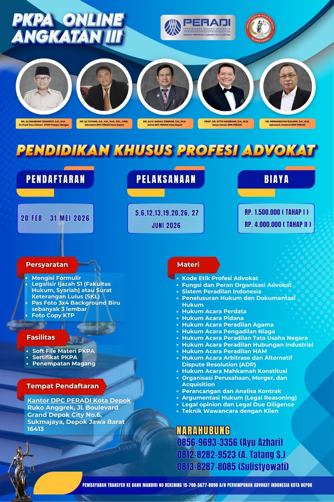 Emsatunews.co.id, Depok – Dewan Pimpinan Cabang (DPC) PERADI Kota Depok kembali menunjukkan komitmennya dalam mencetak penegak hukum yang berkualitas. Organisasi profesi ini resmi membuka pendaftaran Pendidikan Khusus Profesi Advokat (PKPA) Online Angkatan III bagi para sarjana hukum di seluruh Indonesia.
