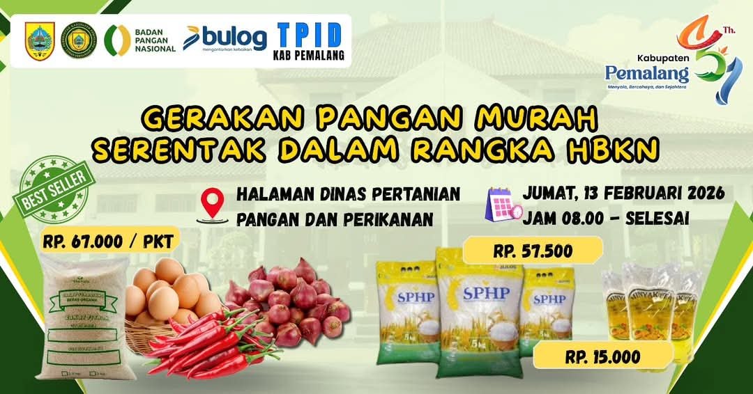 ​Program intervensi pasar ini dijadwalkan berlangsung pada Jumat (13/2/2026), bertempat di Halaman Kantor Distanparik Kabupaten Pemalang. Kegiatan yang dimulai pukul 08.00 WIB ini difokuskan untuk menjaga stabilitas pasokan dan harga pangan menjelang Hari Besar Keagamaan Nasional (HBKN).