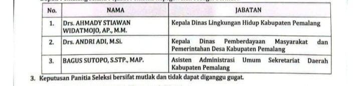 Keputusan panitia seleksi ini bersifat final dan menjadi landasan bagi Bupati Pemalang selaku Pejabat Pembina Kepegawaian untuk memilih salah satu figur definitif sebagai penggerak roda birokrasi daerah.