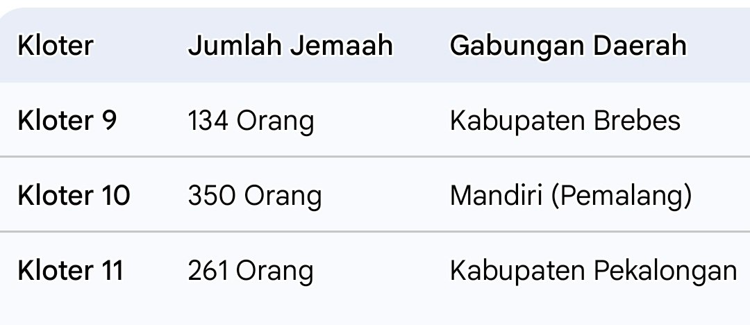 Plt Kepala Kantor Kementerian Agama (Kemenag) Kabupaten Pemalang, Asrofi, merincikan bahwa 749 jemaah tersebut dibagi menjadi tiga kelompok terbang (kloter):