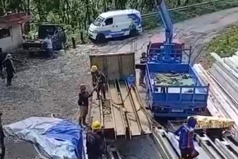 Pantauan di lokasi pada Minggu (5/4/2026) menunjukkan aktivitas alat berat yang cukup sibuk. Sebuah crane biru dikerahkan untuk mengevakuasi rangkaian balok baja dari badan jembatan. Para pekerja yang mengenakan Alat Pelindung Diri (APD) lengkap terlihat sigap memindahkan material galvalum dan kerangka baja ke armada pengangkut untuk memperlancar arus logistik proyek.