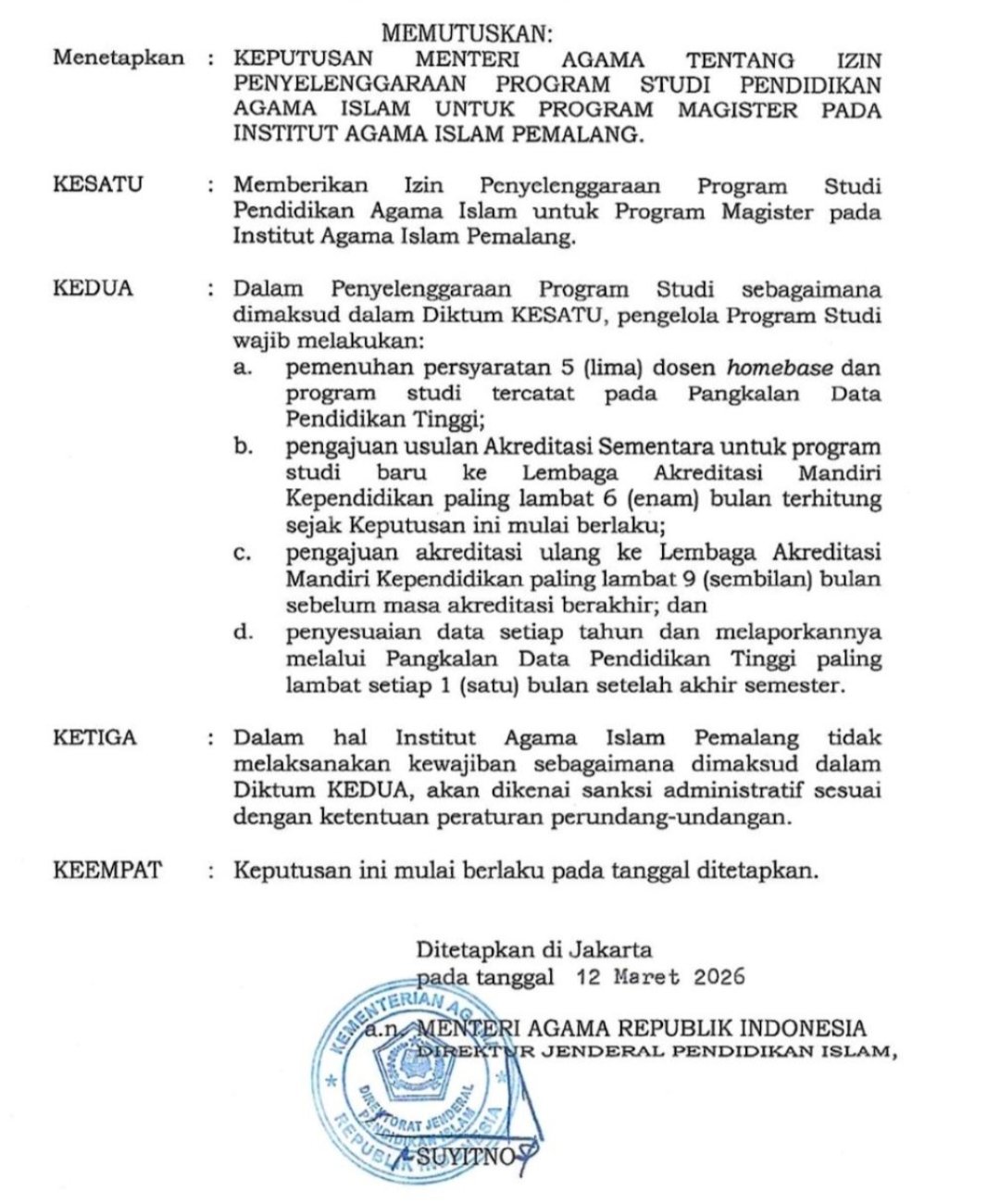Izin operasional tersebut tertuang dalam Keputusan Menteri Agama (KMA) RI Nomor 237 Tahun 2026. Kehadiran program pascasarjana ini menjadi langkah besar bagi INSIP dalam meningkatkan kualitas sumber daya manusia, khususnya di bidang pendidikan Islam di Jawa Tengah.