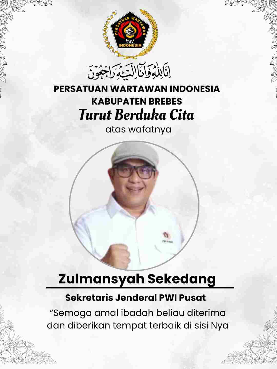 EMSATUNEWS.CO.ID, BREBES — Pengurus Persatuan Wartawan Indonesia (PWI) Kabupaten Brebes menyampaikan duka cita mendalam atas wafatnya Sekretaris Jenderal (Sekjen) PWI Pusat, Zulmansyah Sekedang, pada Sabtu (18/4) dini hari sekitar pukul 00.05 WIB.