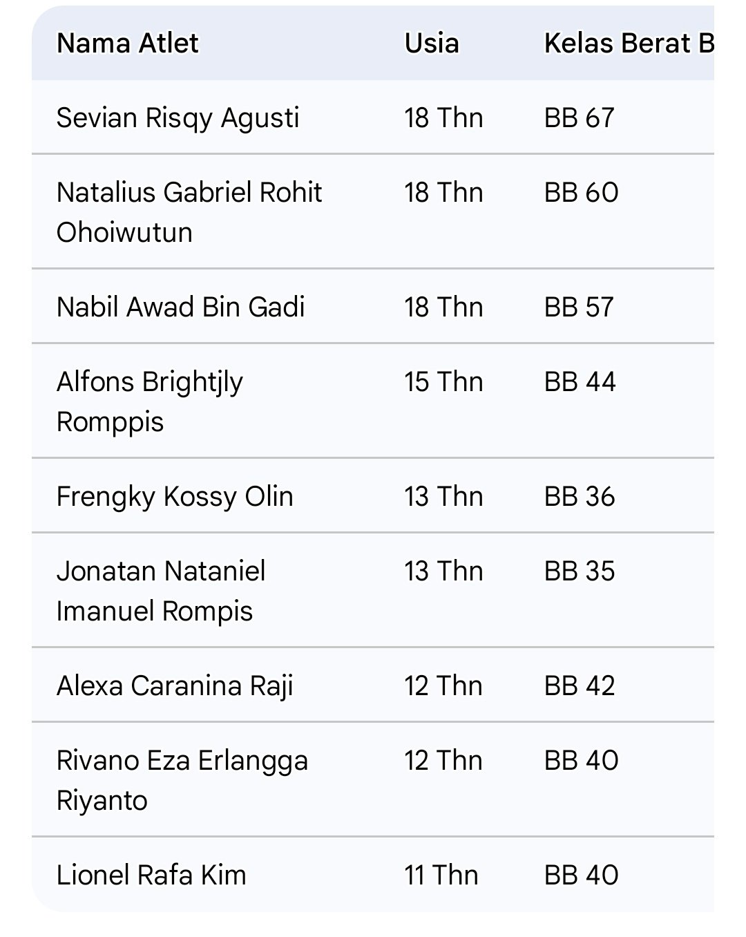 Singo Barong membuktikan keseriusannya dengan mengirimkan perwakilan di berbagai kelas berat badan (BB), mulai dari kategori anak-anak hingga remaja. Berikut daftar sembilan atlet yang akan bertolak ke Purwodadi: